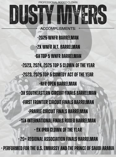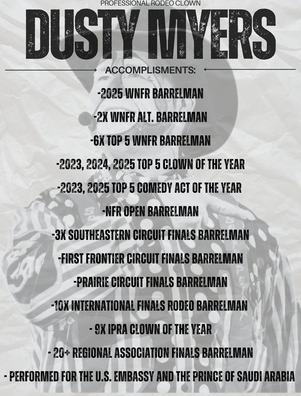Dusty Myers is a top notch rodeo clown. He brings the old school rodeo clown style and makes it his own! He is a true professional in and out of the arena, not to mention, one of the kindest people you will ever meet.